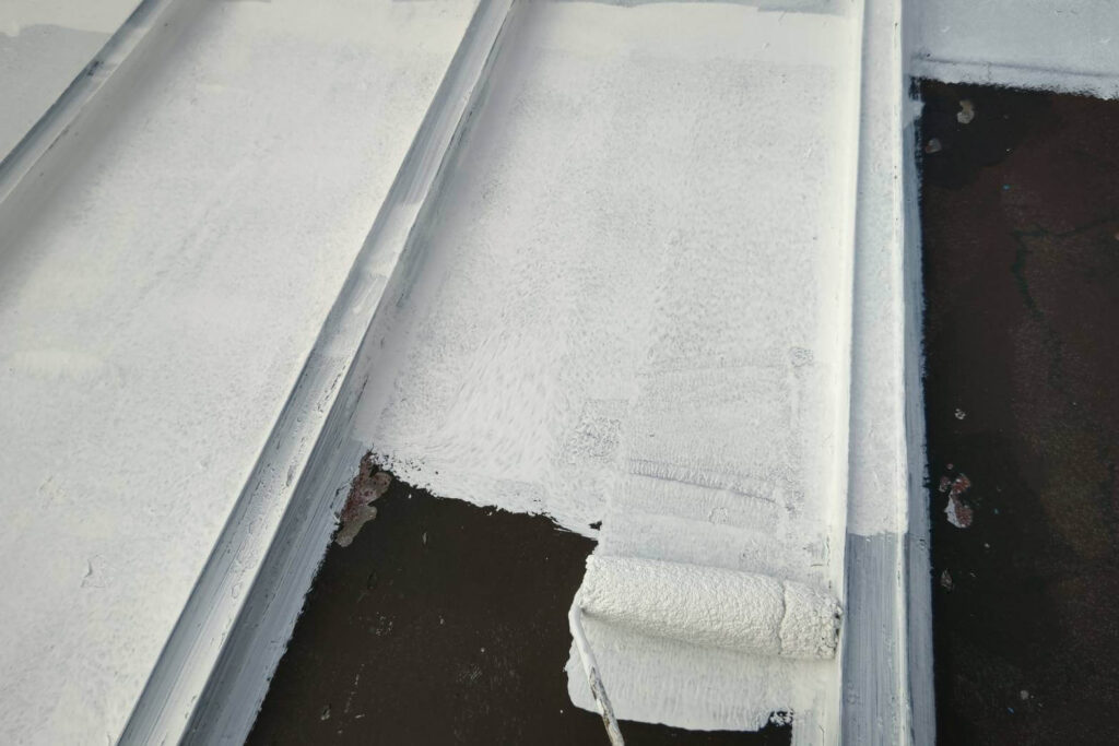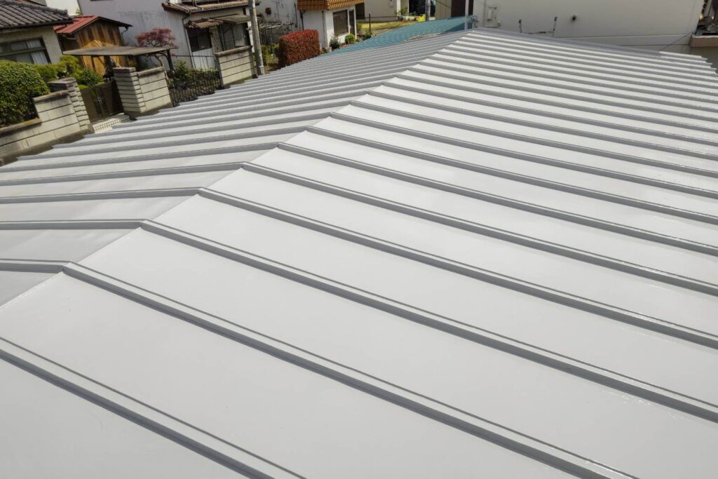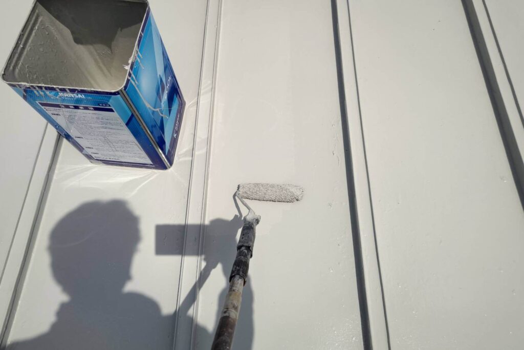 仕上げには、関西ペイントの遮熱塗料「アレスクール2」を使用。中塗り・上塗りの2工程で丁寧に仕上げました。遮熱塗料は、太陽光の熱を反射することで屋根の表面温度上昇を抑え、室内の温度上昇を軽減する効果が期待できます。特にトタン屋根は熱を持ちやすいため、夏場の体感温度の改善に繋がります。