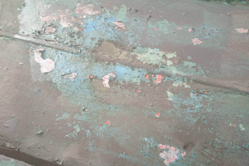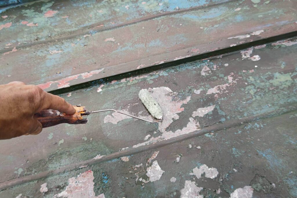 まずはケレン作業からスタート。既存の浮いた塗膜や脆弱な部分をしっかり除去し、塗料が密着できる下地を整えます。この工程を怠ると、どんな高性能な塗料を使用しても早期剥離の原因となるため、非常に重要な作業です。