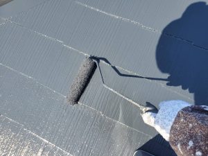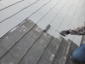 屋根の下塗りの模様です。KFハイブリットルーフプライマーという下塗り材を塗り込みます。
