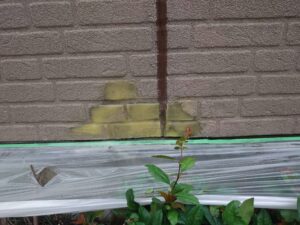 黄色く写っているのがエポキシパテです。外壁のえぐれた部分に補修いたしました。