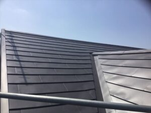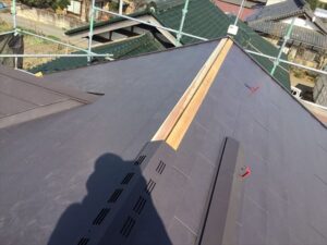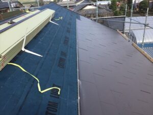 屋根は、まずルーフィングという防水シートを張り、その上から屋根材を敷き詰めていきます。