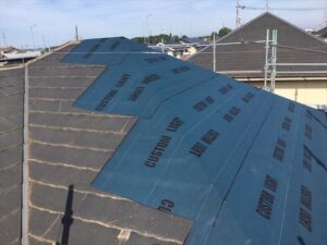 谷部分や一番下の部分から屋根材を貼っていきます。