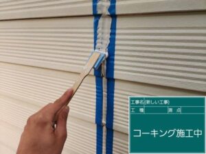 シーリング作業から行います。高耐久のイクシードを使用いたしました。この時期乾燥しているため湿気で固まるシーリング材なので固まりにくいです。