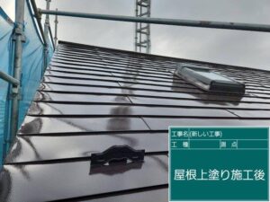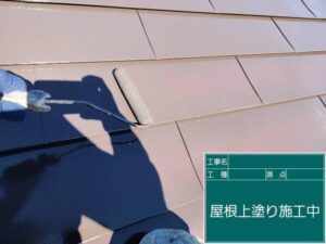 屋根の中塗りです。KFケミカルのワールドセラルーフを使用いたします。20年耐久の自慢の塗料です。