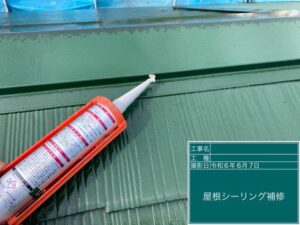屋根の板金部分の釘部分は、水の侵入を防ぐため、シーリングで補修しておきました。